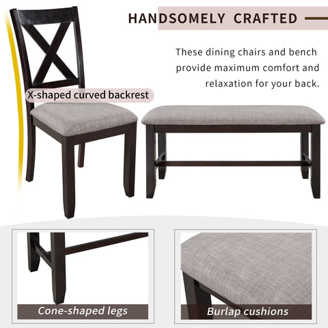 This 6 piece kitchen table and chairs and bench set can be used not only in dining room but also in the office, bar, pub, restaurant and other business places for its rustic, contemporary, delicate and elegant look.