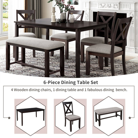 The rustic style dining room table set includes 1 wood rectangular table, 4 wood chairs with padded seat cushion, and 1 bench. Sturdy wood frame with gray finish, vintage furniture while incorporating modern flexibility design, you can create an elegant and warm interior dining nook with this 6-piece dining set.