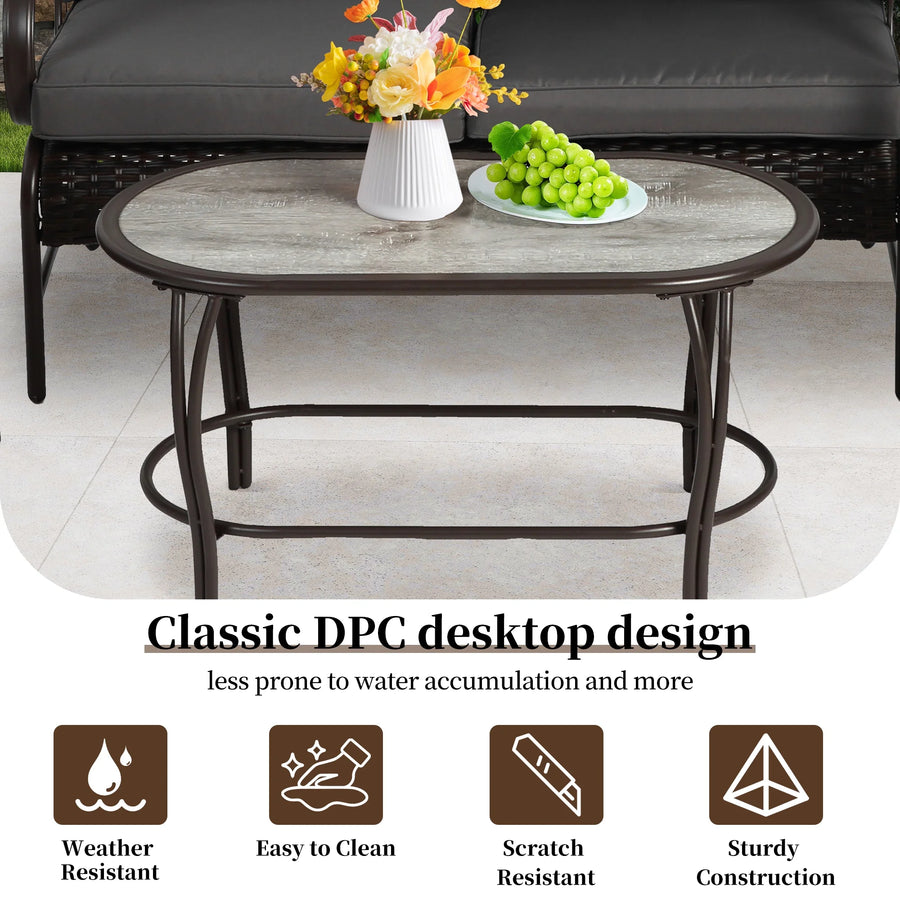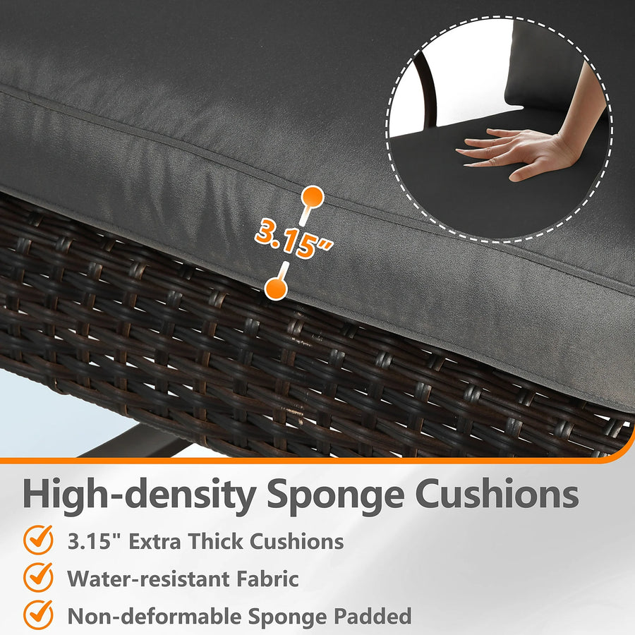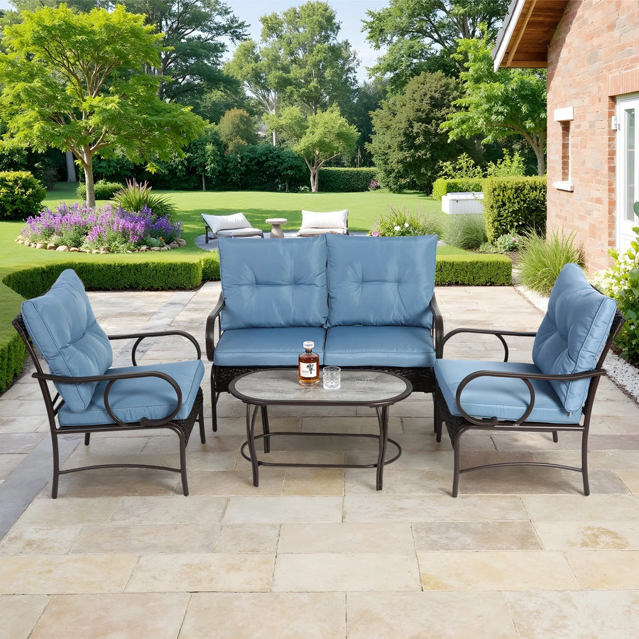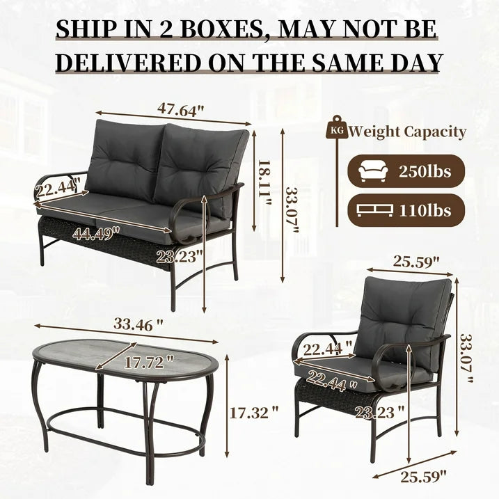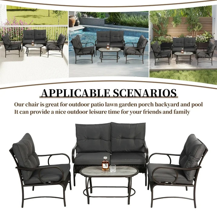 Looking to experience outdoor leisure in style and comfort? This patio furniture set fits the bill. Crafted with the utmost care, our 4-piece PE rattan patio furniture set offers a truly inviting space for friends and family to gather and engage in heartfelt conversations. Plus, its steel frame and sturdy legs provide peace of mind that you're relaxing on a sturdy furniture set. Lounge comfortably on plush, water-resistant cushions with durable fabric that withstands the elements.