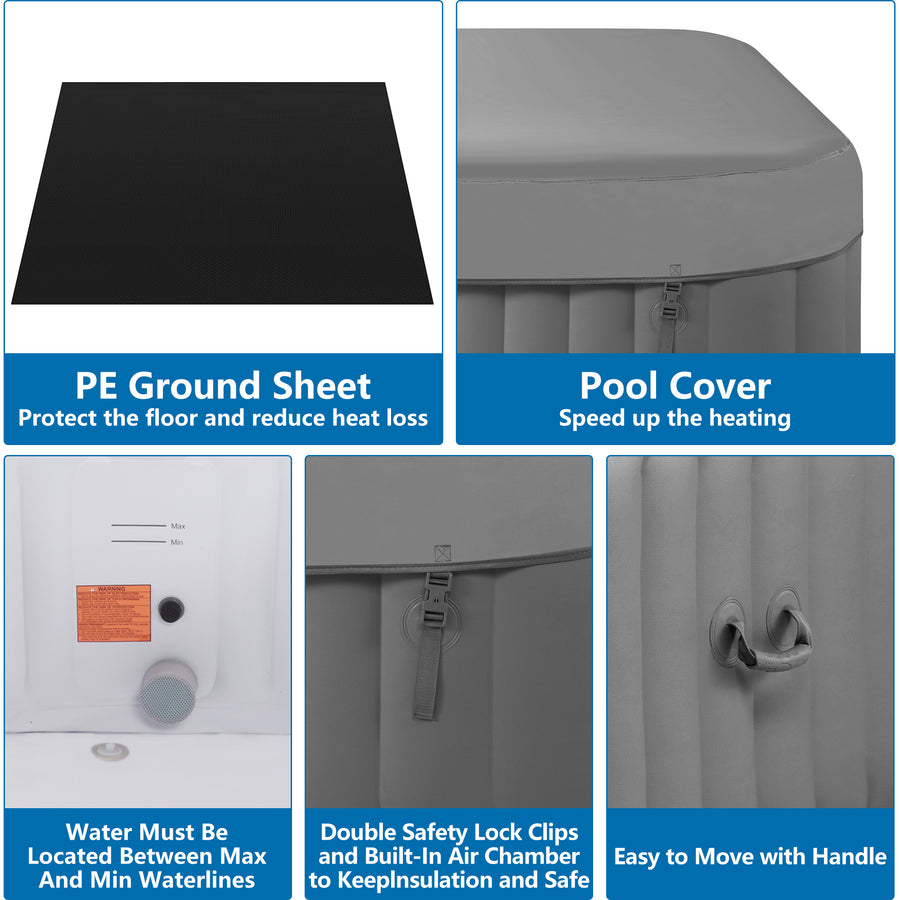 【High Quality & Durable】Our inflatable hot tub is made of eco-friendly, durable, and puncture-resistant PVC material to ensure superior durability and comfort. In addition, it comes with a PE floor mat to protect your floor and reduce heat loss.