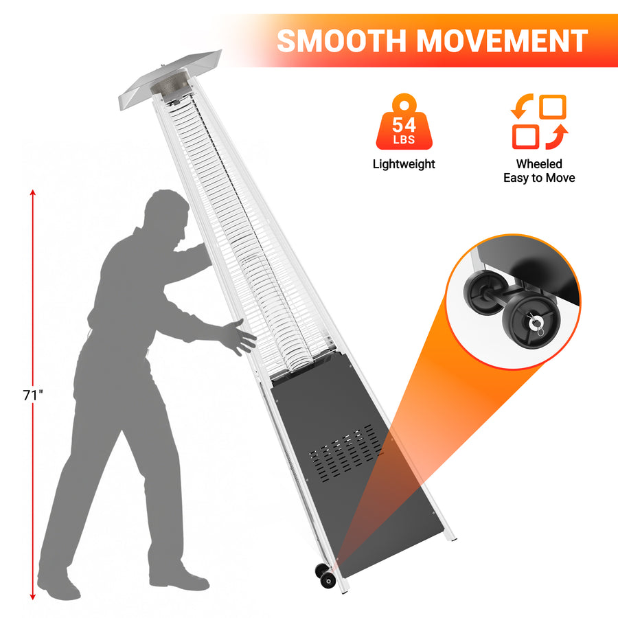 【A MESMERIZING CENTERPIECE OF DANCING FLAME】Standing at an impressive 89.37 inches tall, the patio heater immediately draws the eye with its elegant pyramid design. At its core, a mesmerizing column of fire dances safely within a quartz glass tube, creating a hypnotic visual that is guaranteed to captivate your guests. This dynamic flame provides not only exceptional warmth but also a luxurious, ambient glow that elevates any atmosphere, turning an ordinary night into an unforgettable experience.